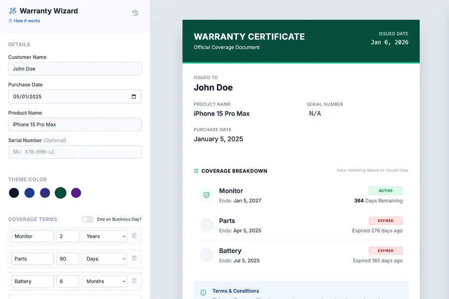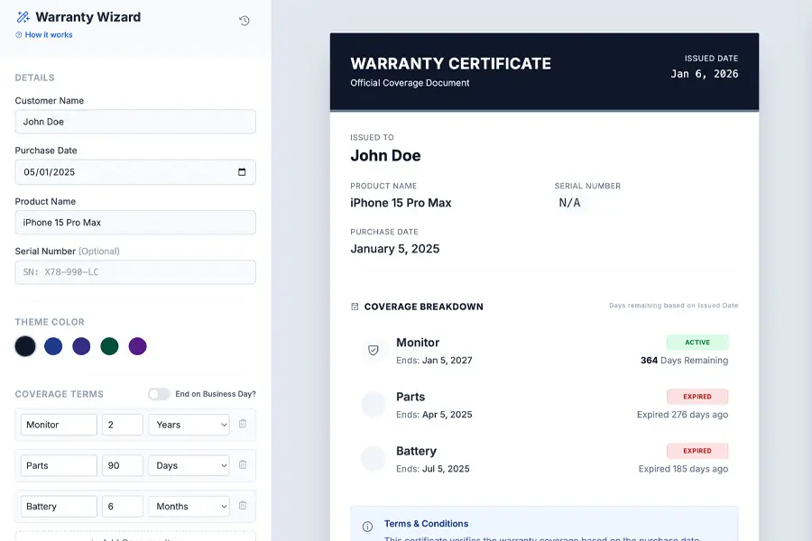 Calculate warranty start and end dates accurately based on job or purchase dates. Avoid confusion and give customers clear, professional warranty timelines.